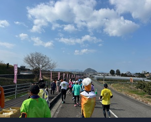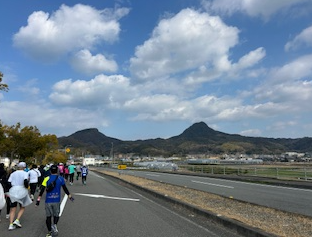 北条地域では、北条高校・北条南中、そして北条北中学校との連合吹奏楽部による応援演奏があり、ランナーに力を与えていました。北条の風景、特に難波地域の恵良山と腰折山を背景にランナーが帯状に見えるのは、圧巻でした。途切れない沿道の応援も疲れたランナーを後押ししていました。正岡地域でのコースは鹿島が真っすぐ見え、すがすがしいものでした。中高生やそれぞれの地域の応援が醍醐味の愛媛マラソン。1度は挑戦してみるのもいいものですね。